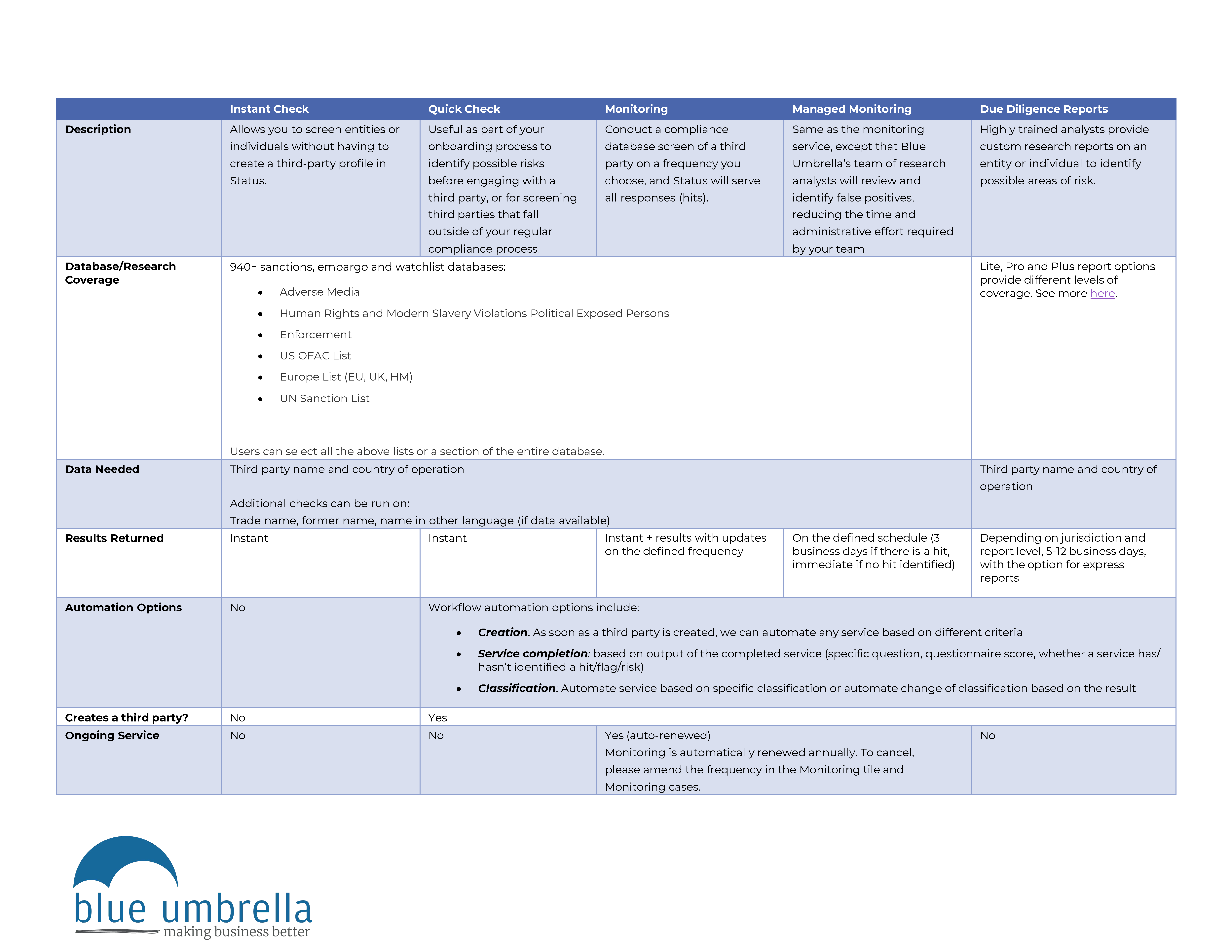 Description: Blue Umbrella’s due diligence reports are compiled by highly trained research analysts, working in 40+ languages in our operations centers. The reports are available in Lite, Pro and Plus. Learn more about the differences between due diligence report levels here.