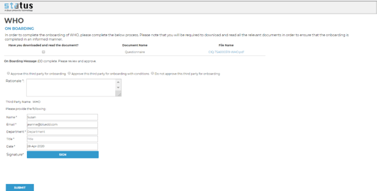 Clicking the link takes the approver to Status without the need for further authentication. The approver details are pre-populated, but the approver must download all attachments and complete mandatory fields before submitting. The approver's job is to make a decision, provide the rationale and e-sign. Click SUBMIT button to complete the process.