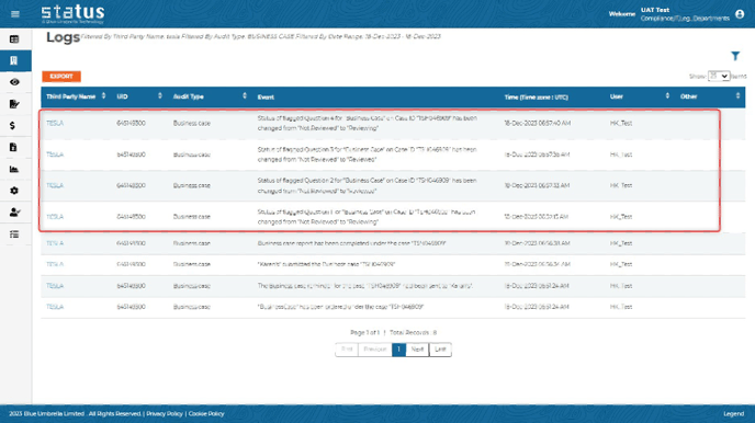 We have improved history logs to increase visibility for changes on any Review Status. Now users can see the previous and updated review status changes, for flagged questions, hits, tiles, monitoring cases, among others, on the Log Page.