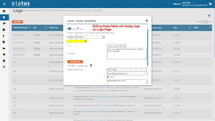 We have added logs to capture previous and new value for changes in Notes and Task/Issue Tacker to increase visibility, to make sure nothing is missed. Now users can see the history log and values on Log Page, when a change, or deletion happens on Notes and Task/Issue Tracker field(s).
