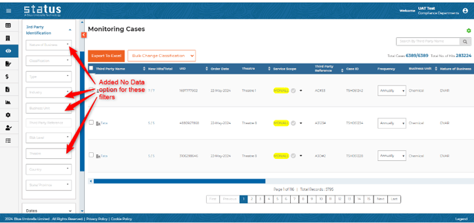 Users can now filter for “empty value” within the following fields: Nature of Business, Industry, Theatre, Case Owner, and Business Unit within Status.