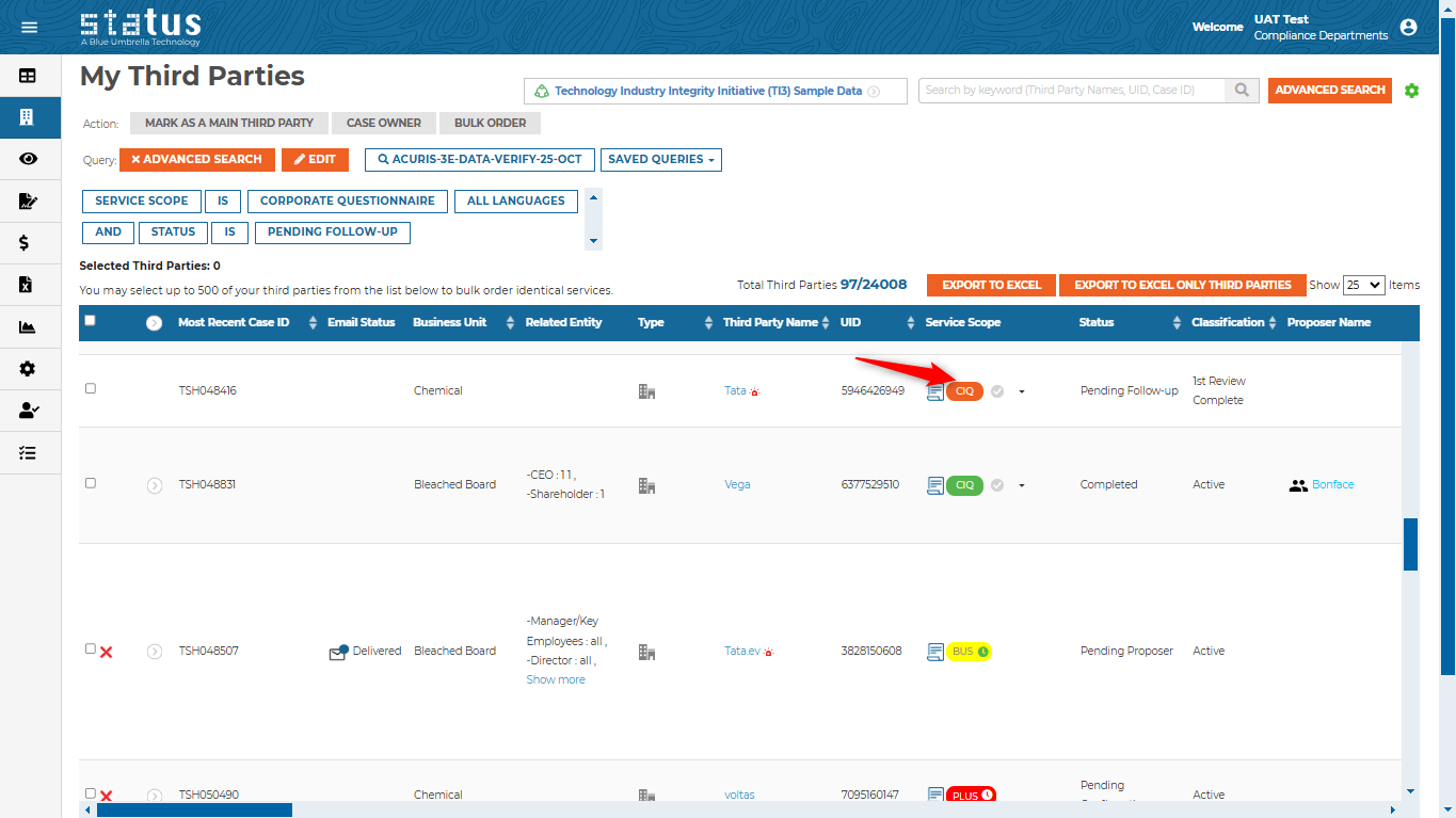 The service scope’s icon will turn orange if the third-party questionnaire is pending follow up.