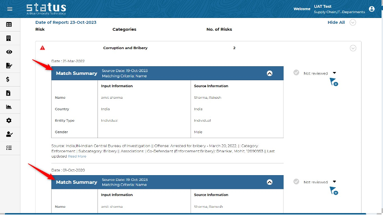 Users can now access the match summary along with the matching criteria while reviewing Quick Check hits from Business Intelligence. For example, a user can quickly see if an entity is relevant or not, before clicking on Read More link.