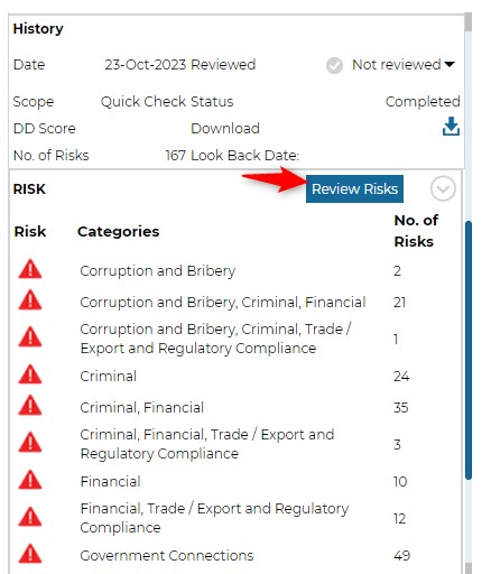 Users will now be directed to the Quick Check Hit & Risks Summary page on Business intelligence while reviewing the Quick Check hits from the Third-Party dashboard. Users can view more results on a full page with less clicks and then take appropriate action.