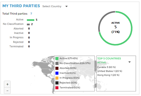 The first thing you see when you log in is the Status dashboard. Once all third parties are imported, the homepage gives you a comprehensive overview of your third party universe.