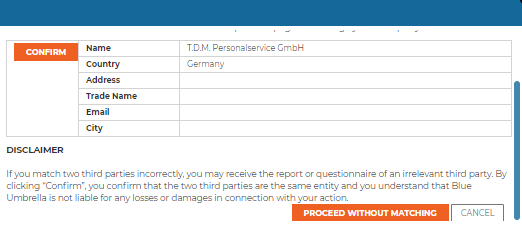 You will be asked to review any possible or exact matches between the third party you are trying to add and another member’s third party. If you match the two third parties and indicate they are the same entity, you will be able to access the third party’s shared questionnaires and completed due diligence.